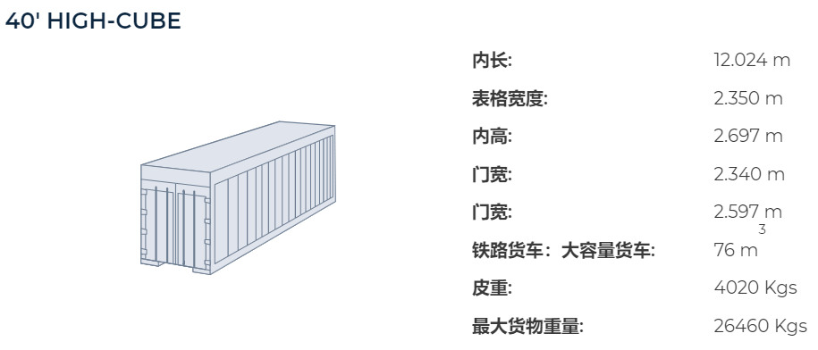 40'HC的精確箱內(nèi)尺寸:12.032m(長)x2.352m(寬)x2.698m(高)。
